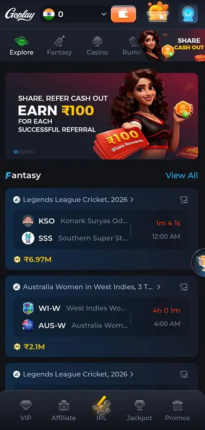 - The Home Screen: All games like Cricket and Color Prediction are here.